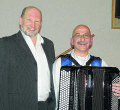 Besondere Auszeichnung: Dominique Bersier bekam vom Deutschen Harmonika- Verband die goldene Ehrennadel für 25 Jahre Mitgliedschaft im Akkordeon- Orchester Tiengen verliehen. Harry Schäuble erhielt die silberne Ehrennadel für 15 Jahre Zugehörigkeit. (Foto: Meyer)