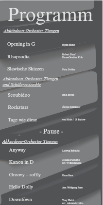 Eine flotte Widergabe erfuhr „Ein kleines Etwas“, lebhafte Erinnerungen an den argentinischen Tango-Großmeister Astor Piazolo rief „Melodie en la menor“ wach. Die der Komposition „Valse Roulette“ zu Grunde liegende heitere Grundstimmung vermochten die Musiker überzeugend zur Geltung zu bringen. Zum Mitsummen animierte der Titel „Zwei deutsche Schlager“ (unter anderem „Kauf dir einen bunten Lufballon“). Beim abschließenden Vortrag „Cappels Melodien Cocktail“ demonstrierten die Interpreten noch einmal ihr hervorragendes Können. Rasch aufeinander folgende Rhythmuswechsel und solche in der Dynamik und beim Tempo bewältigten die Akkordeon-Spieler mit Bravour.